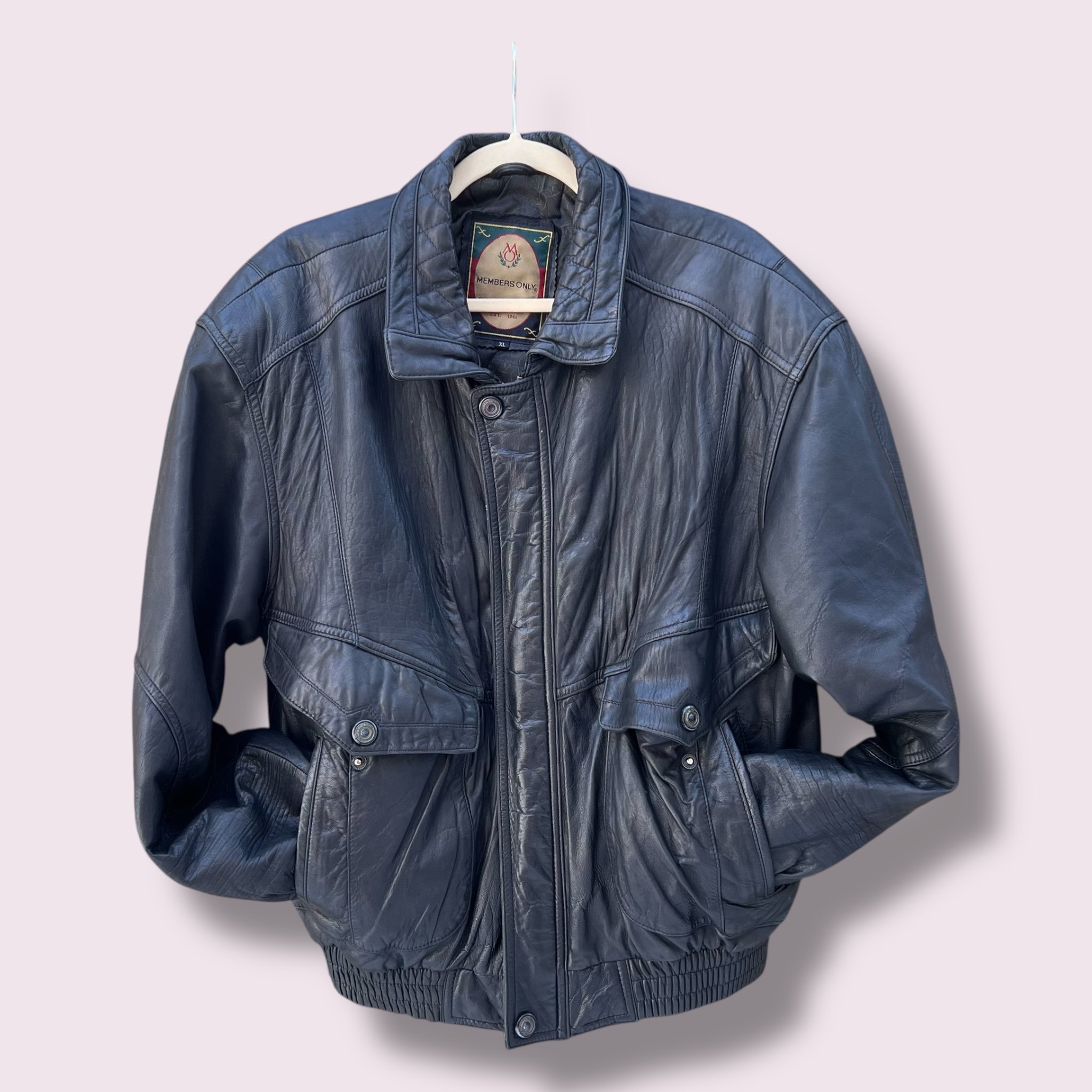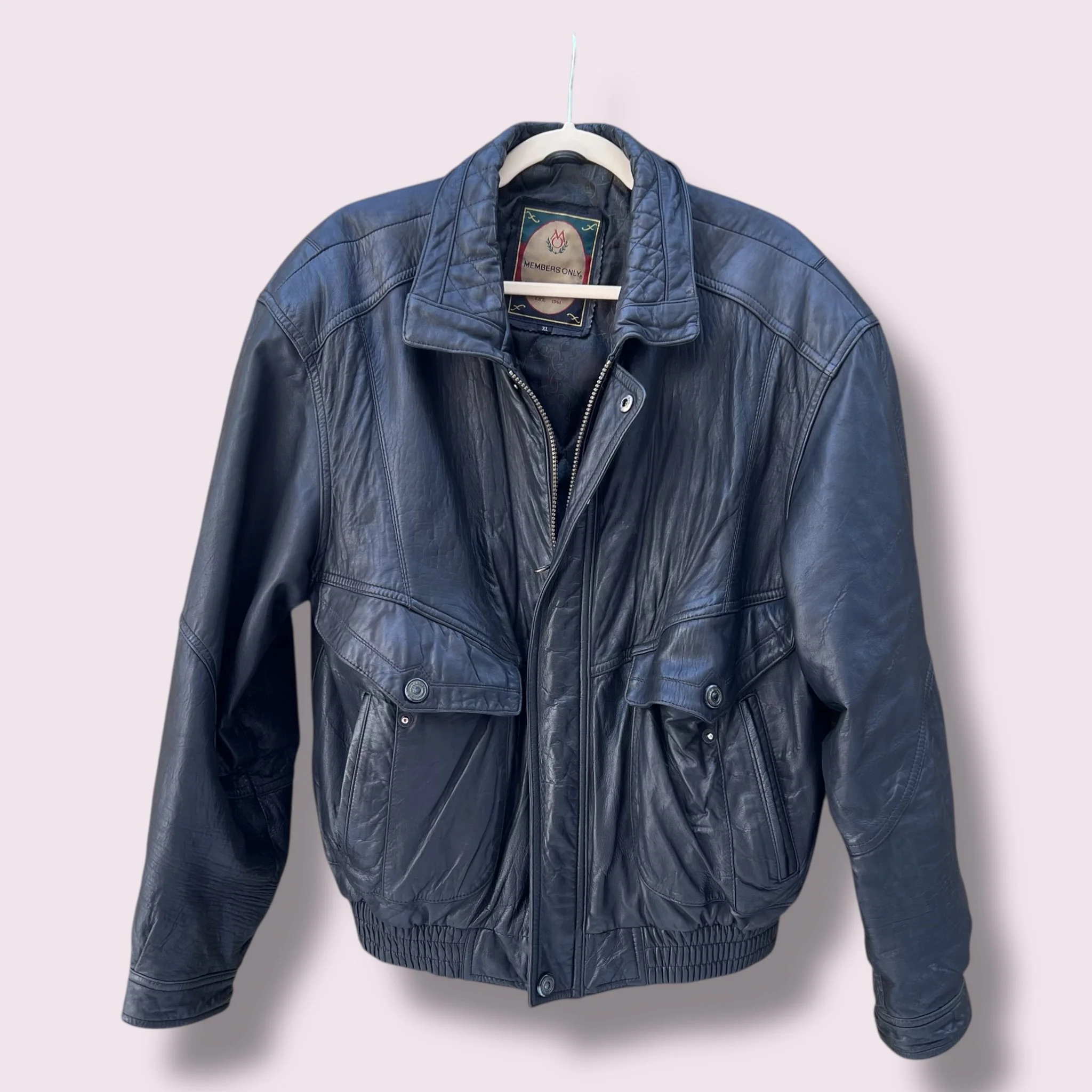 Tag Details: Members Only brand, size XL, genuine leather shell, 100% polyester lining and filler, made in China.