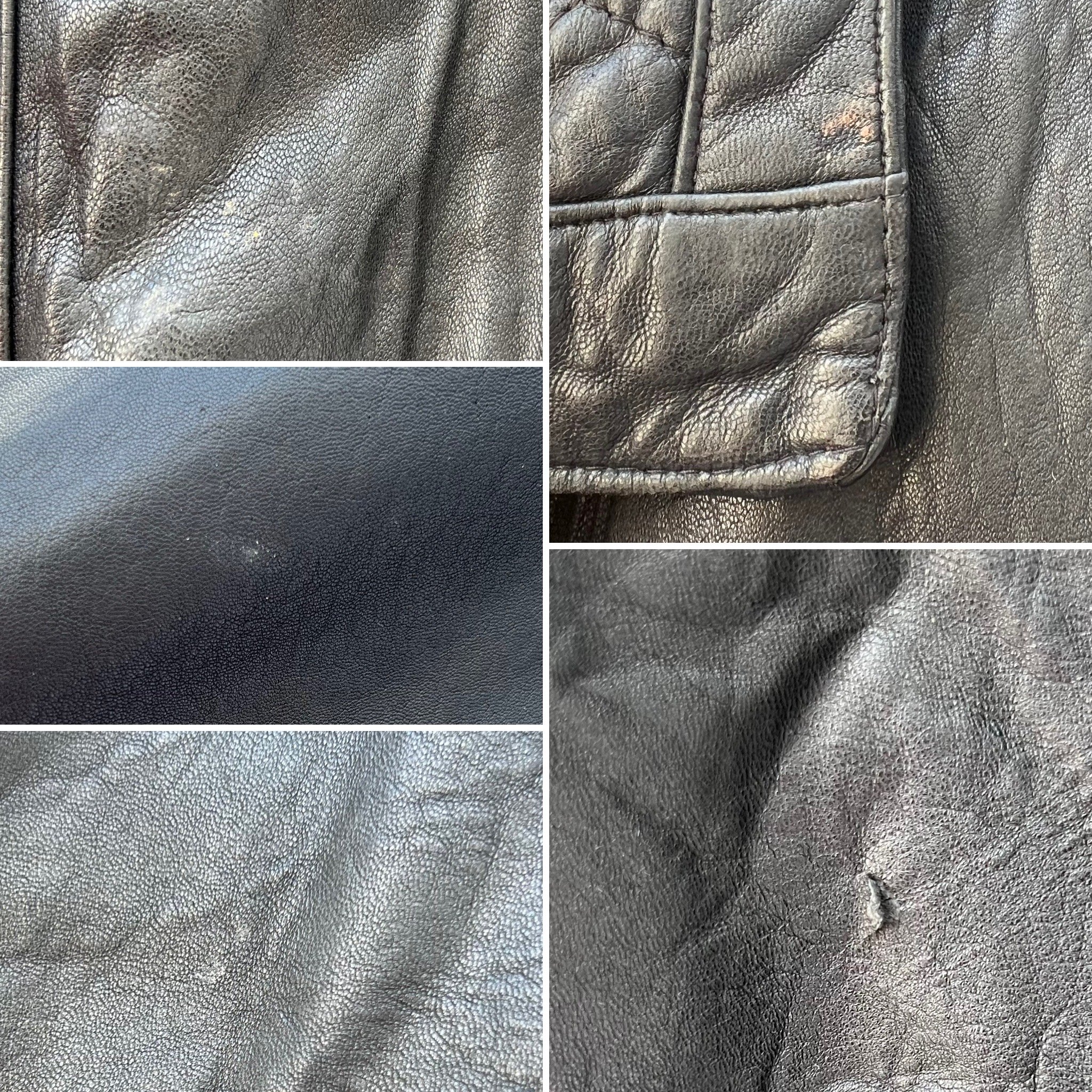 Description: Genuine leather Member’s Only biker bomber jacket with five pockets (one internal) and paisley lining.