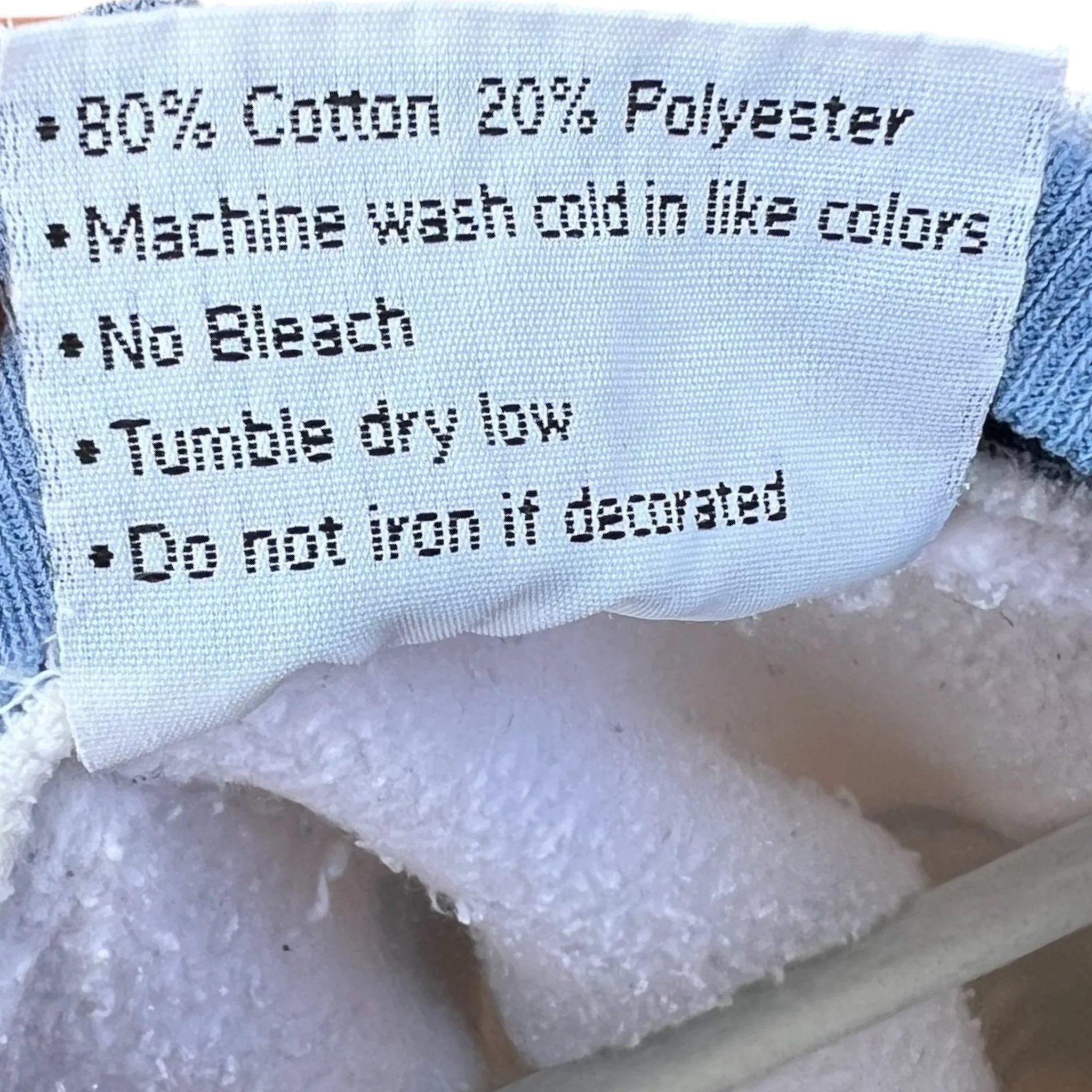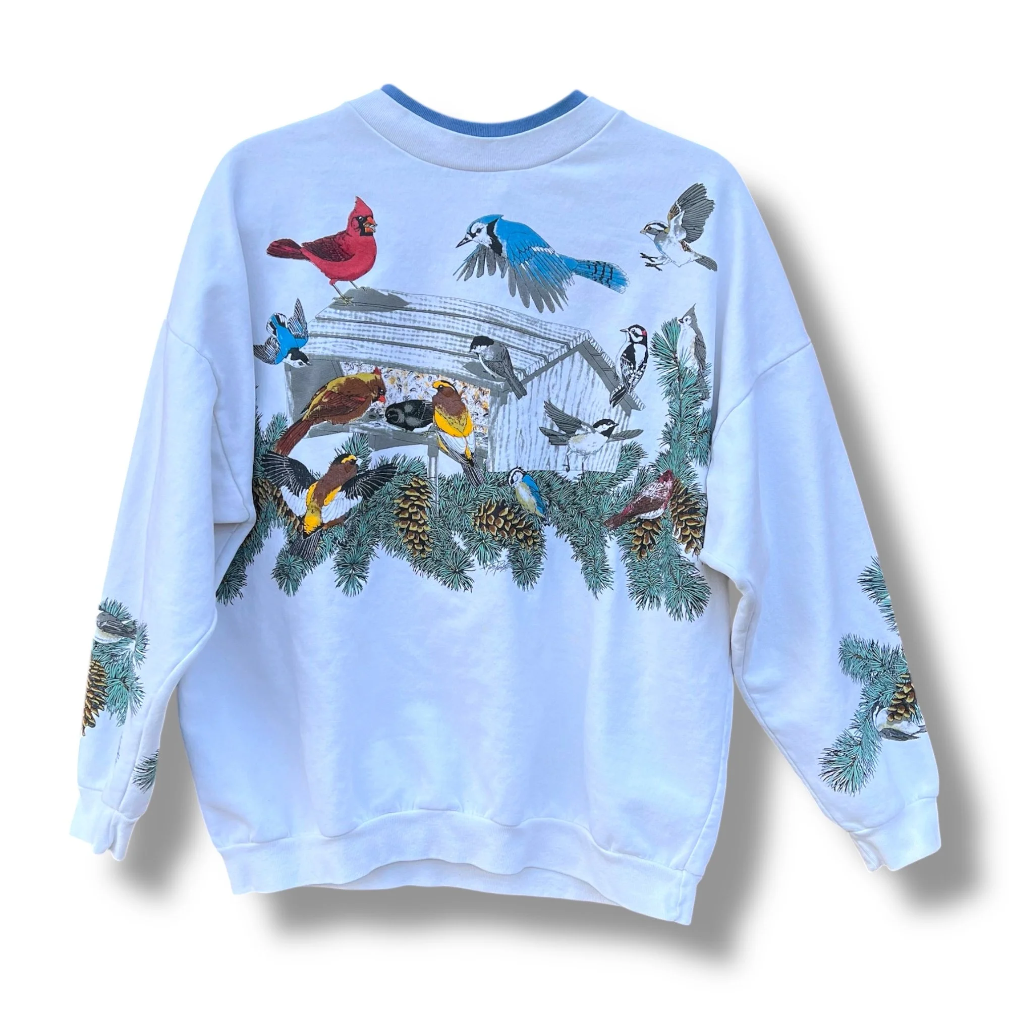 Description: White crewneck sweatshirt with light blue collar and a print of birds in a birdhouse on both front and back.