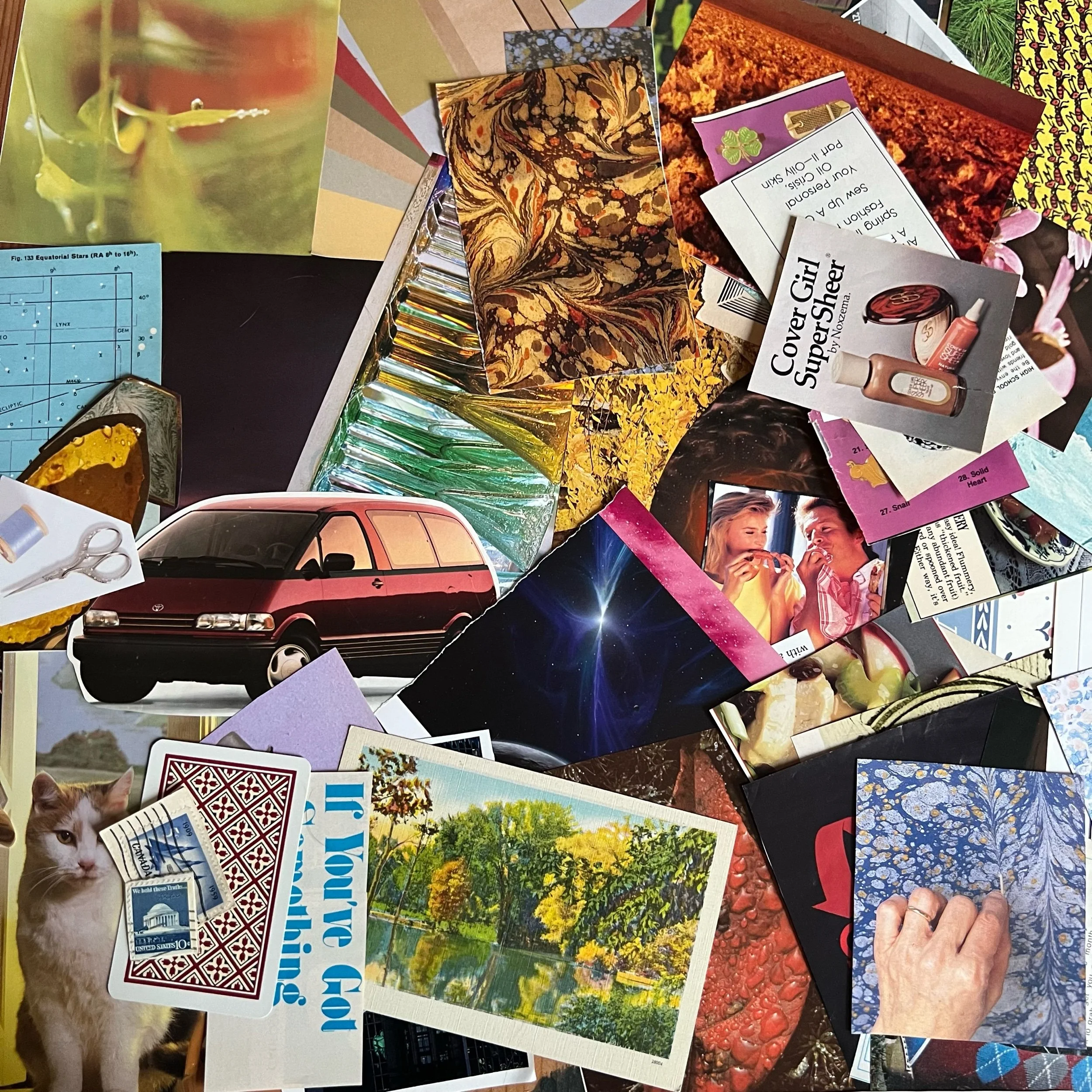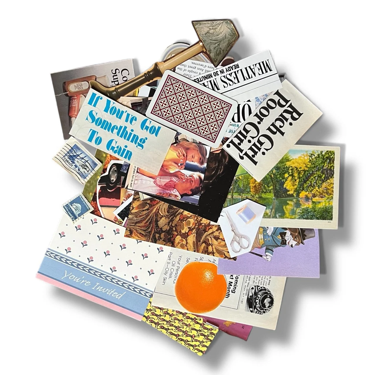 50+ pieces of true vintage paper ephemera from a variety of sources such as postcards, stamps, playing cards, art books, textbooks, children’s books, magazines, and more—all from as early as the 1930s into the early 2000s. Each kit includes a mix of full pages/backgrounds, cut-out images, and text.