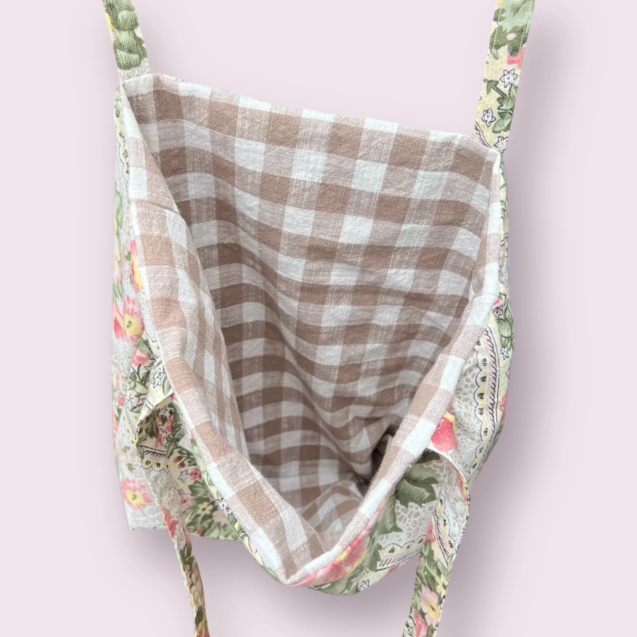 Description: The perfect thrifting tote made from a vintage floral pillowcase with contrasting lining and pocket made from a vintage gingham tablecloth.